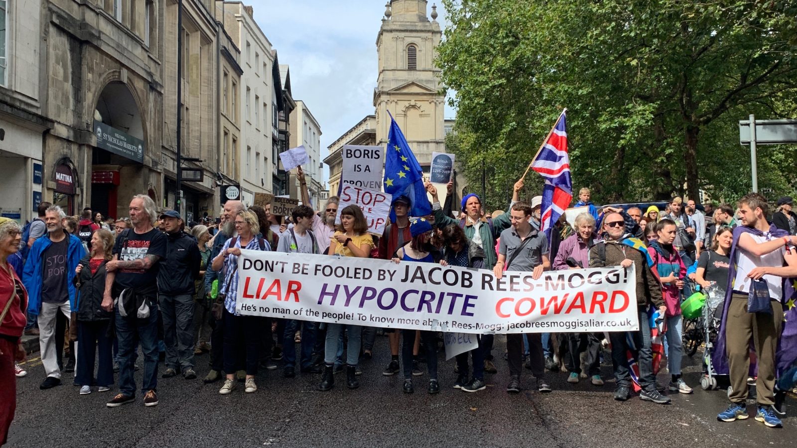 “No one voted for Boris” the crowd sang to the tune of the White Stripes’ Seven Nation Army as they made their way from Cabot Circus past Castle Park.