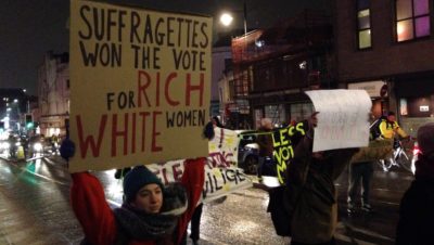 The march was forced to stop for around five minutes outside the Wills Memorial Building when it was confronted by a counter-protest of around half a dozen women claiming that suffragettes represented white privilege.