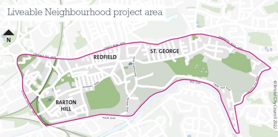 The liveable neighbourhood scheme will cover a wide area south of Lawrence Hill, Church Road and Summerhill Road. The area is bordered by Troopers Hill Road in the east, St Phillips Causeway in the west, and the Feeder Canal and the River Avon in the south.