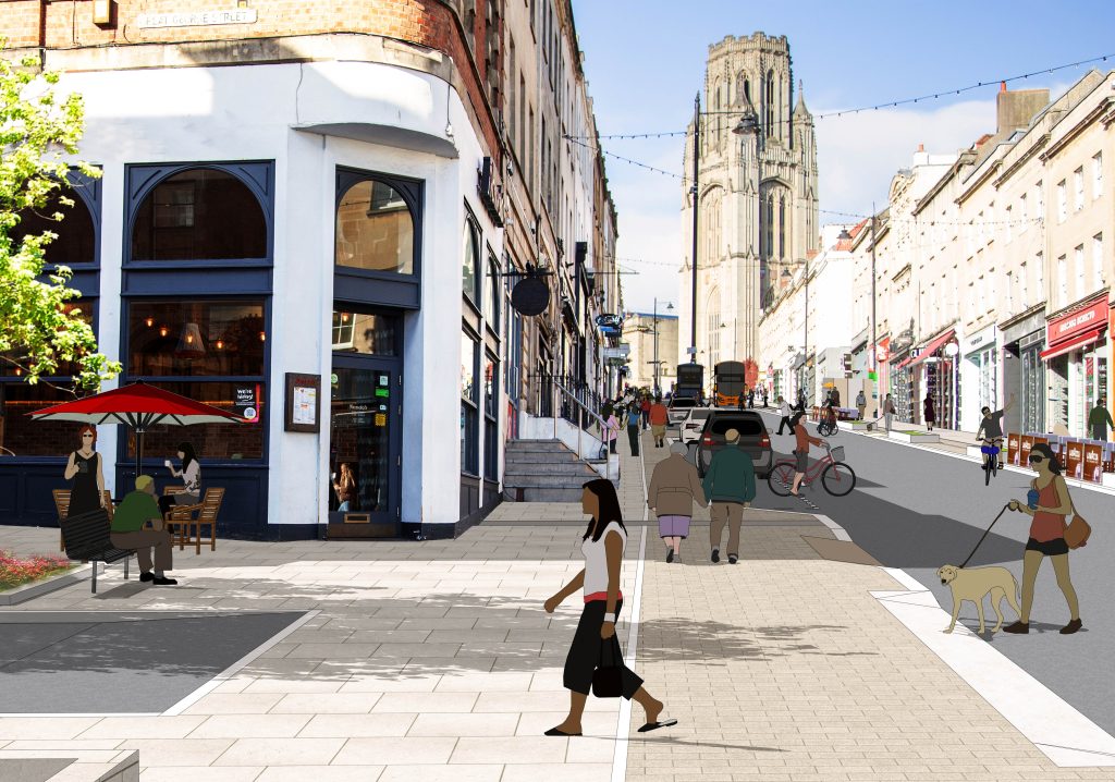 The purpose of the scheme is to increase the number of trips made by bus, walking, wheeling and cycling by improving bus journey times and making active travel safer and easier. It also aims to encourage more people to spend time in the Park Street and Queen’s Road area by creating new and inviting public spaces – image: Bristol City Council