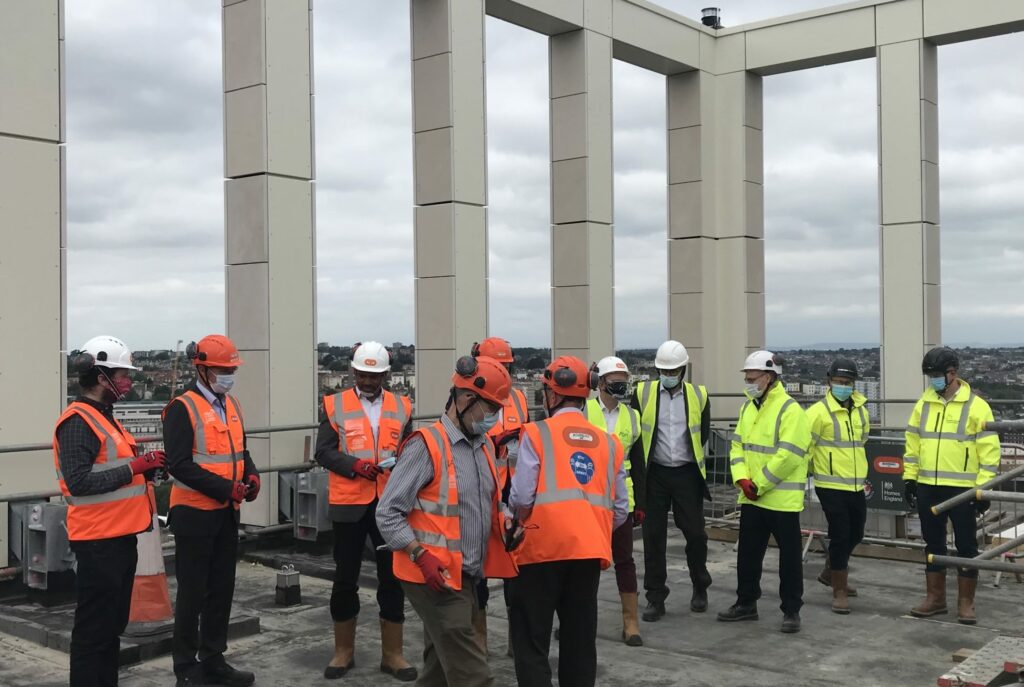 Former Bristol mayor Marvin Rees joined lots of other men in hi-vis at the top of Castle Park View tower soon before it opened in 2021 – photo: Martin Booth