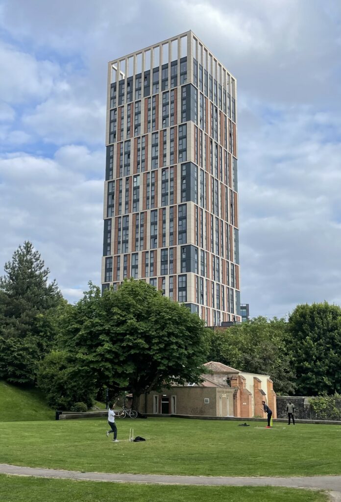 A game of cricket being played in the shadow of Castle Park View tower – photo: Martin Booth