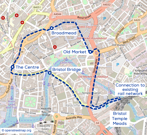 Tram-trains coming from suburban railway lines including the Severn Beach line could switch to tram mode here; then run down Friary to connect with a city centre loop via Bristol Bridge, the Centre, Bond Street and Temple Way.