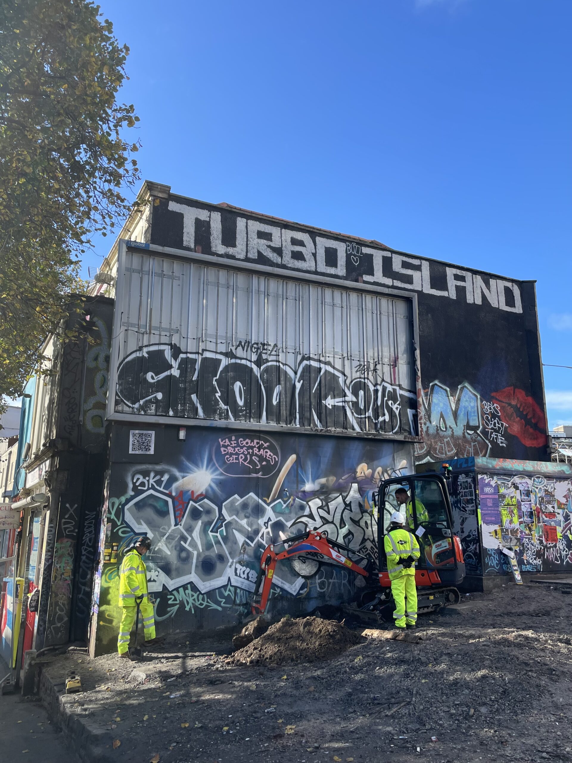 At 11am, three workers in yellow hi-vis jackets were on Turbo Island, with one sat inside a small digger.