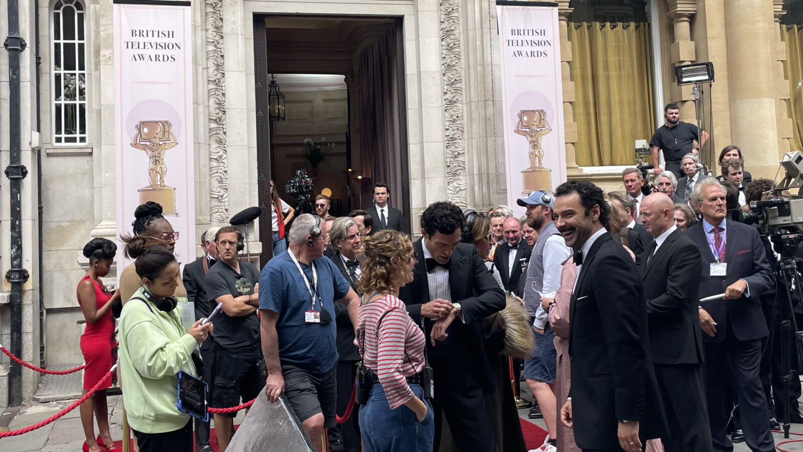 Dozens of actors wore suits and dresses for a red carpet scene that appeared to relate to the British Television Awards.
