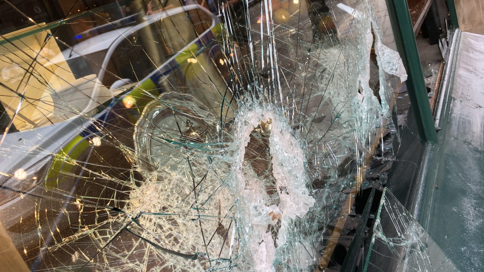 A gang of four men on two motorbikes, wielding axes and sledgehammers, targeted the historic Grey-Harris and Co in Princess Victoria Street at around 12.50pm on Monday.