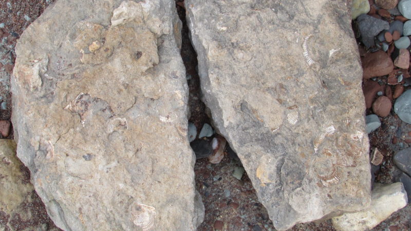 Close ups of fossils found in rocks at Aust Cliff. Image: Michael Day via Flickr.
