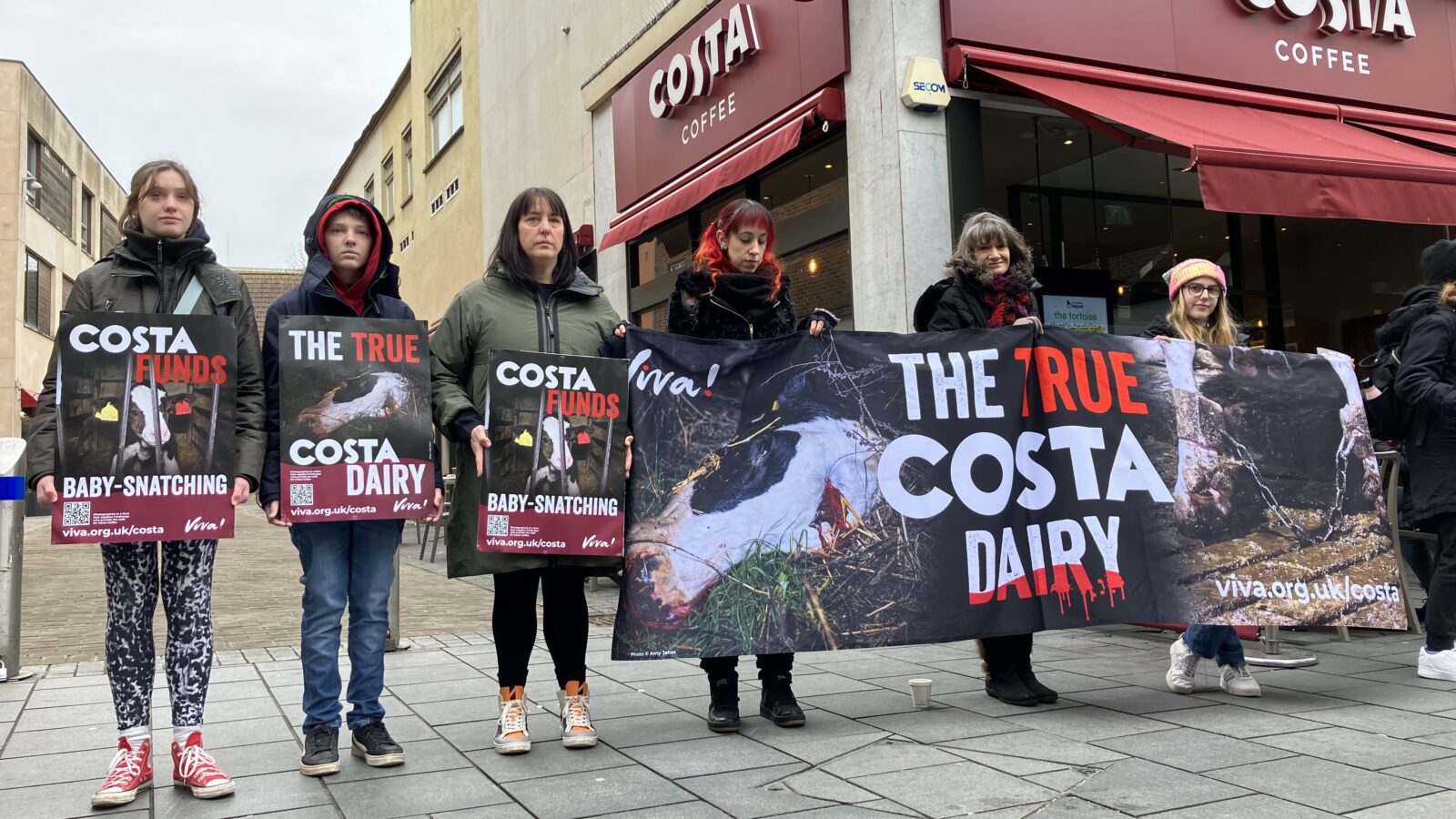 Activists from vegan charity Viva! stood outside Costa in Broadmead to reveal what they call “the true Costa dairy” following its undercover investigation into a farm in Kent.