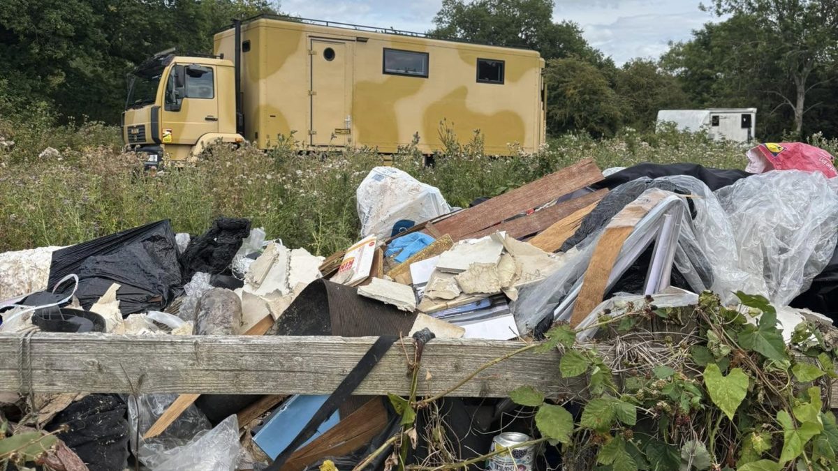 Surrounding the vehicle are metal fences and piles of rubbish including tyres, almost a dozen full black bags, mattresses and industrial waste such as wallpaper and flooring.