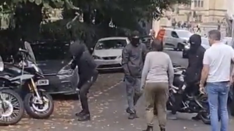 After being confronted by a woman, one of the group immediately jumps on their bike ready to leave, but then another of the men wearing balaclavas grabs the hammer back off him before having another attempt at breaking the bike lock.