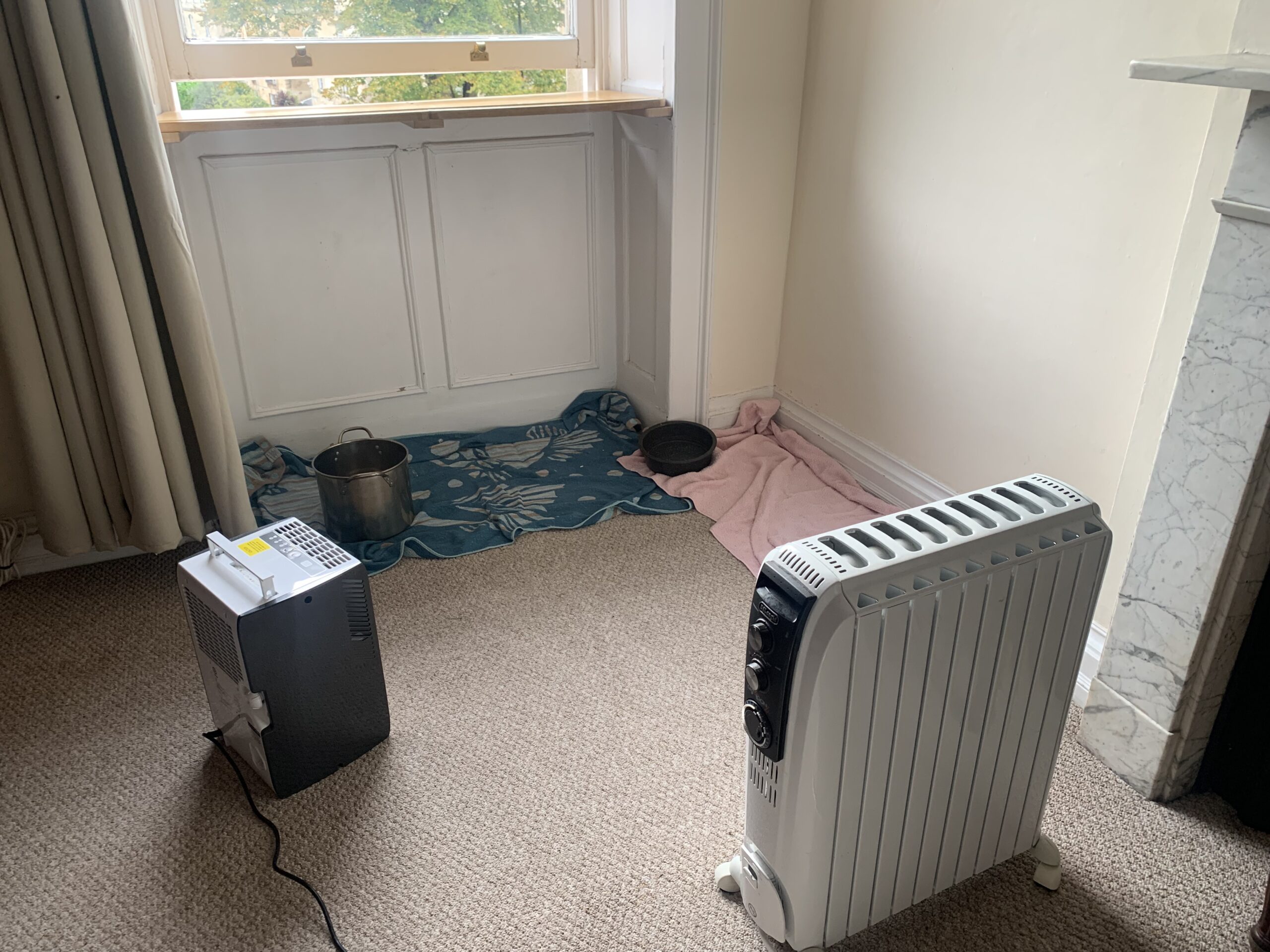 Elizabeth and her partner have had to put down dehumidifiers, towels and pans for six months to try and avoid damp – photo: Mia Vines Booth