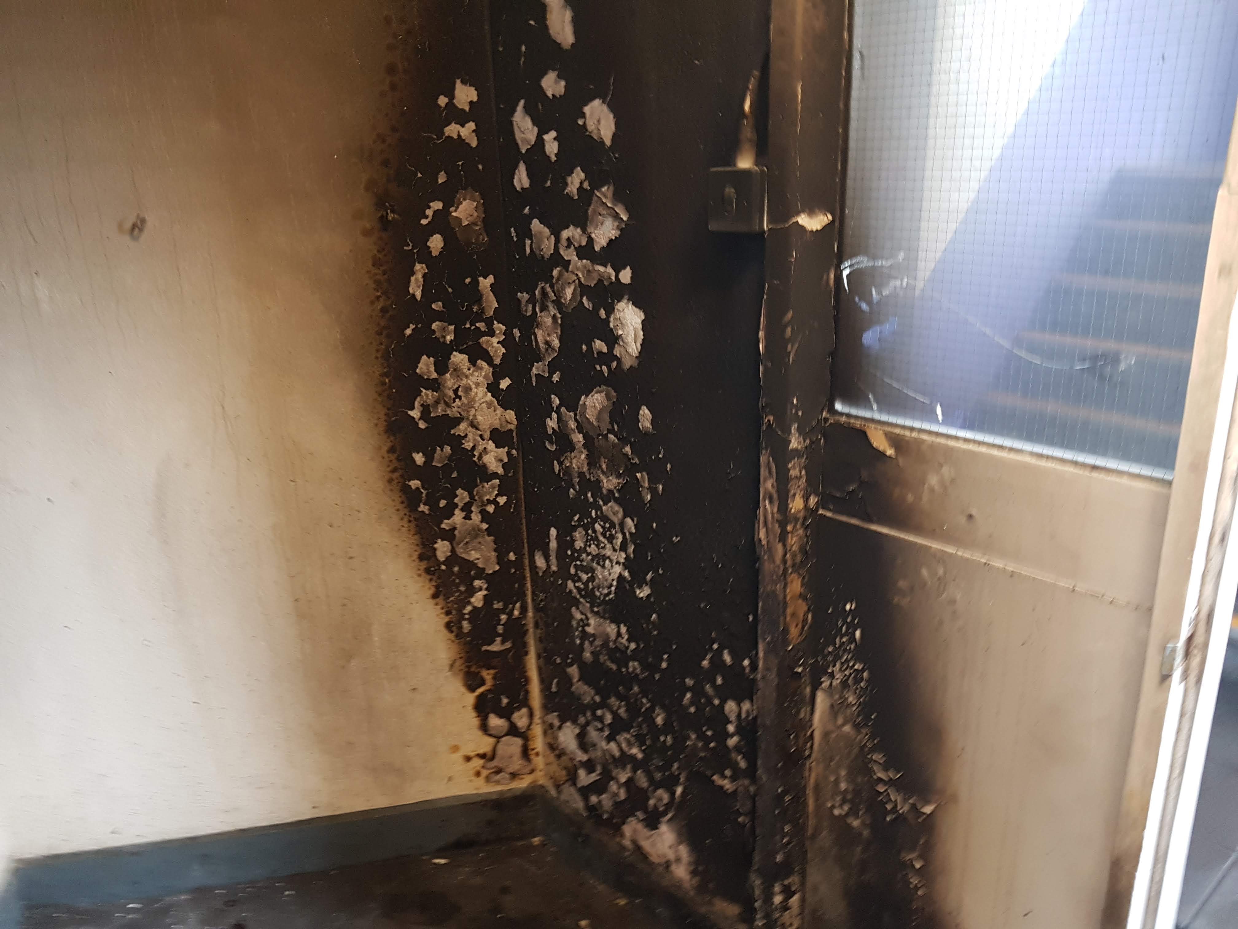 Walking through the communal door, Abdi points out the flame-ravaged wall opposite the lift, opening a door into the bin storage area to show yet more charred remnants of the fires that have taken hold inside.