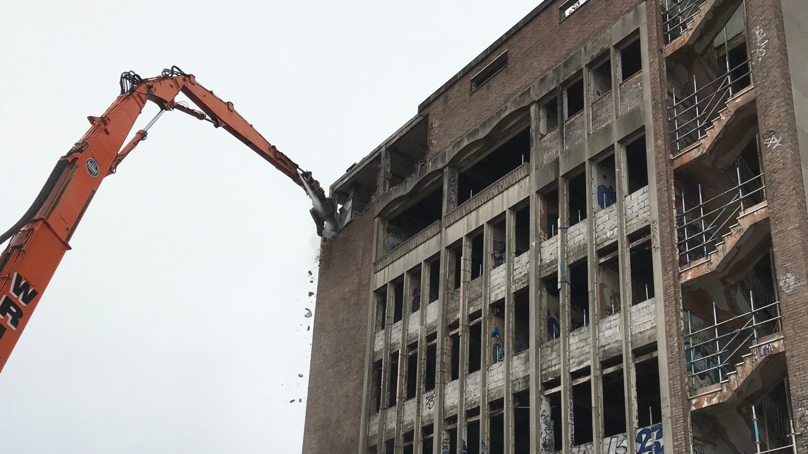 Soon before midday, a rotary pulveriser (known colloquially as a muncher) begun nibbling away at one corner of the building, bricks cascading to the floor below.