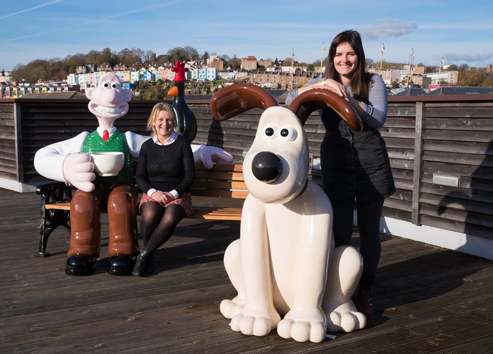 Wallace, Gromit and Feathers on the roof of Aardman’s HQ in Spike Island with Becky Davy (left) and Lauren Howard (right) from The Grand Appeal