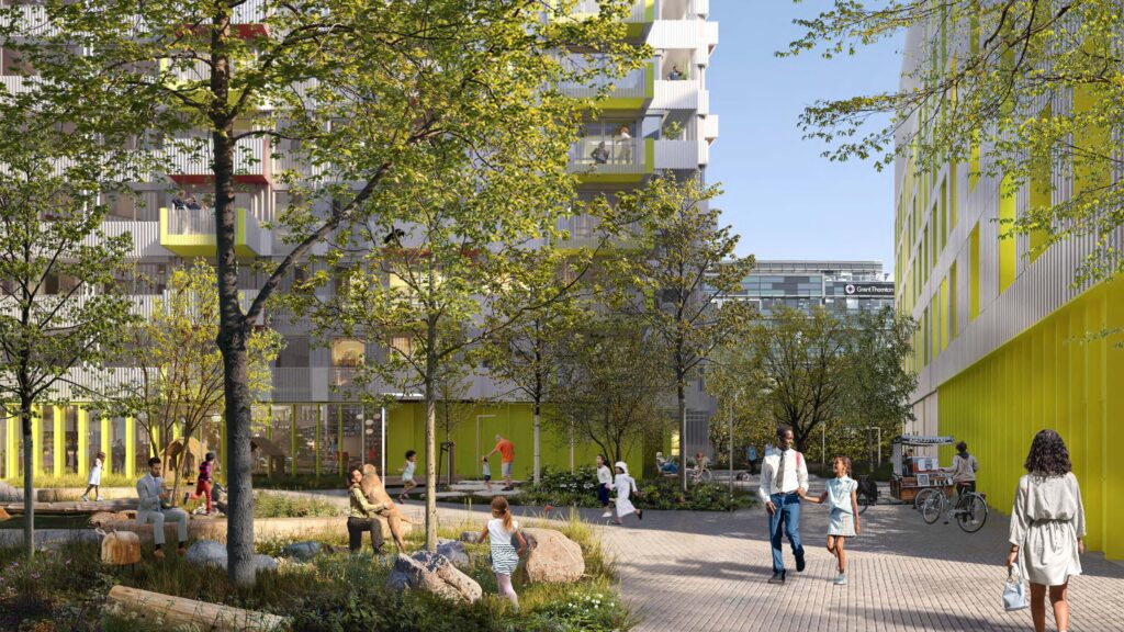 “Rather than one single building covering the whole site, the new scheme opens the site up with a green space now positioned between the three separate buildings.”