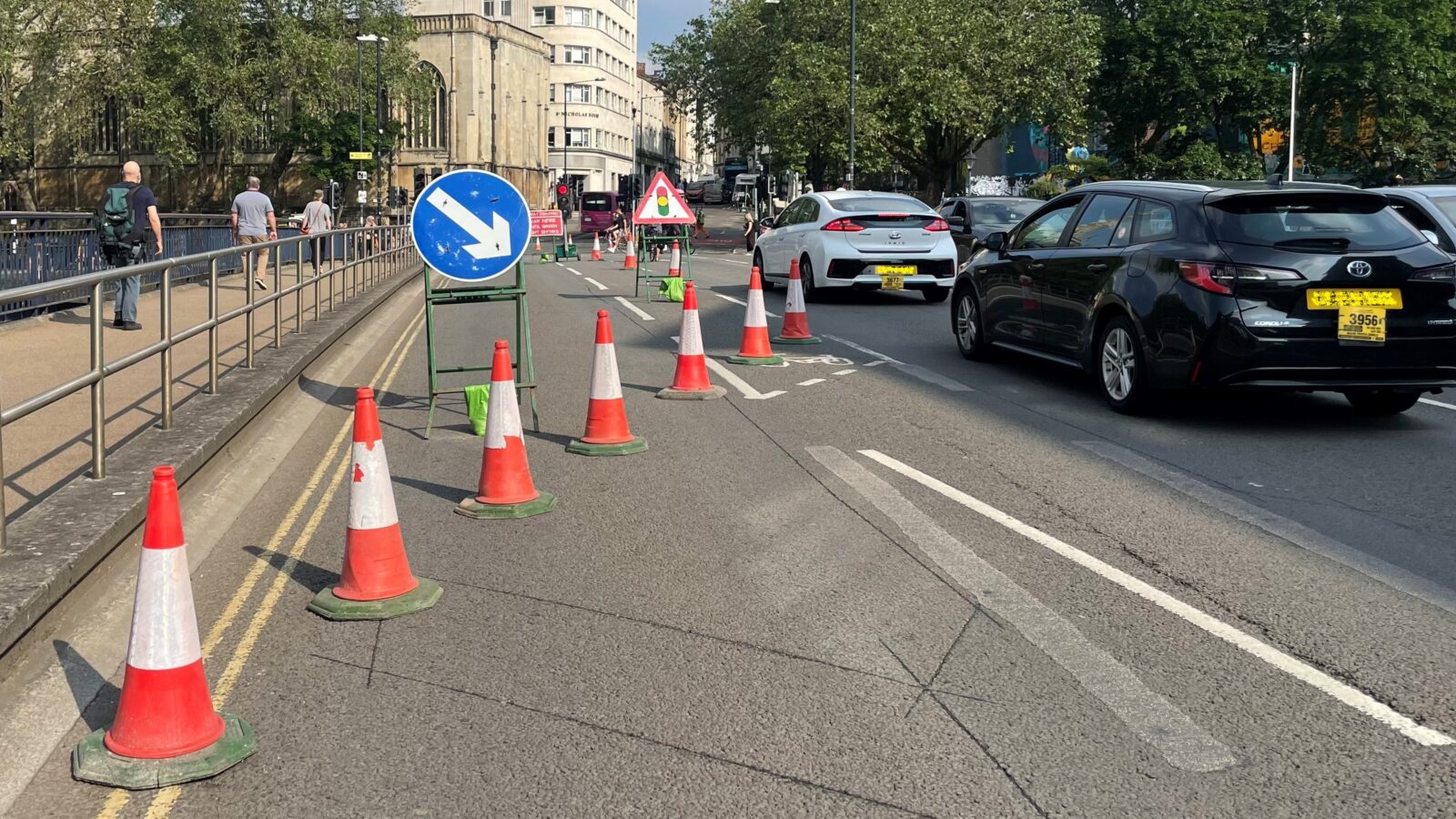 Cones were being put in place by workmen in hi-vis orange trousers and yellow jackets on Monday morning ahead of construction work on a scheme that aims to make travelling across Bristol Bridge easier for pedestrians and cyclists.