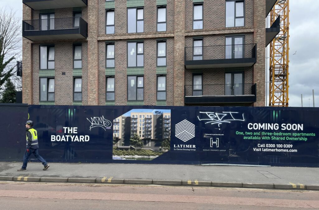 A sign on the hoarding around the Boatyard on Bath Road says that the new flats are “coming soon” but work has remained unfinished since builders Mid Group collapsed into administration in July 2022.