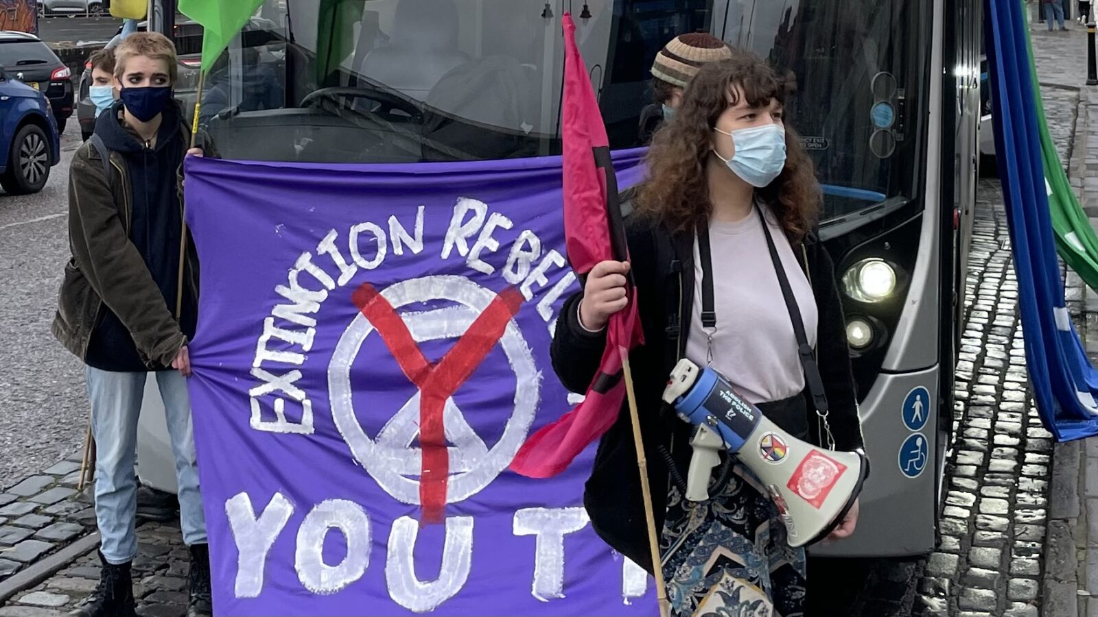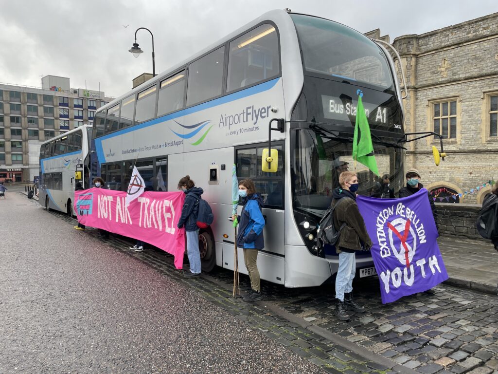 Extinction Rebellion Youth Bristol are demanding free bus travel within the West of England for all those under the age of 25, all students and all apprentices, with one banner held up by the bus reading ‘fair travel, not air travel’.