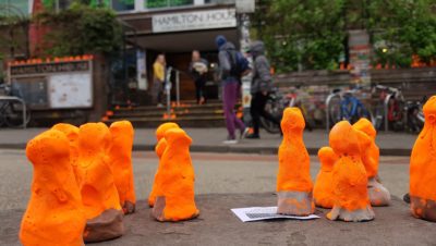Orange figurines lined the streets outside Hamilton House to portray the artists that have had to leave