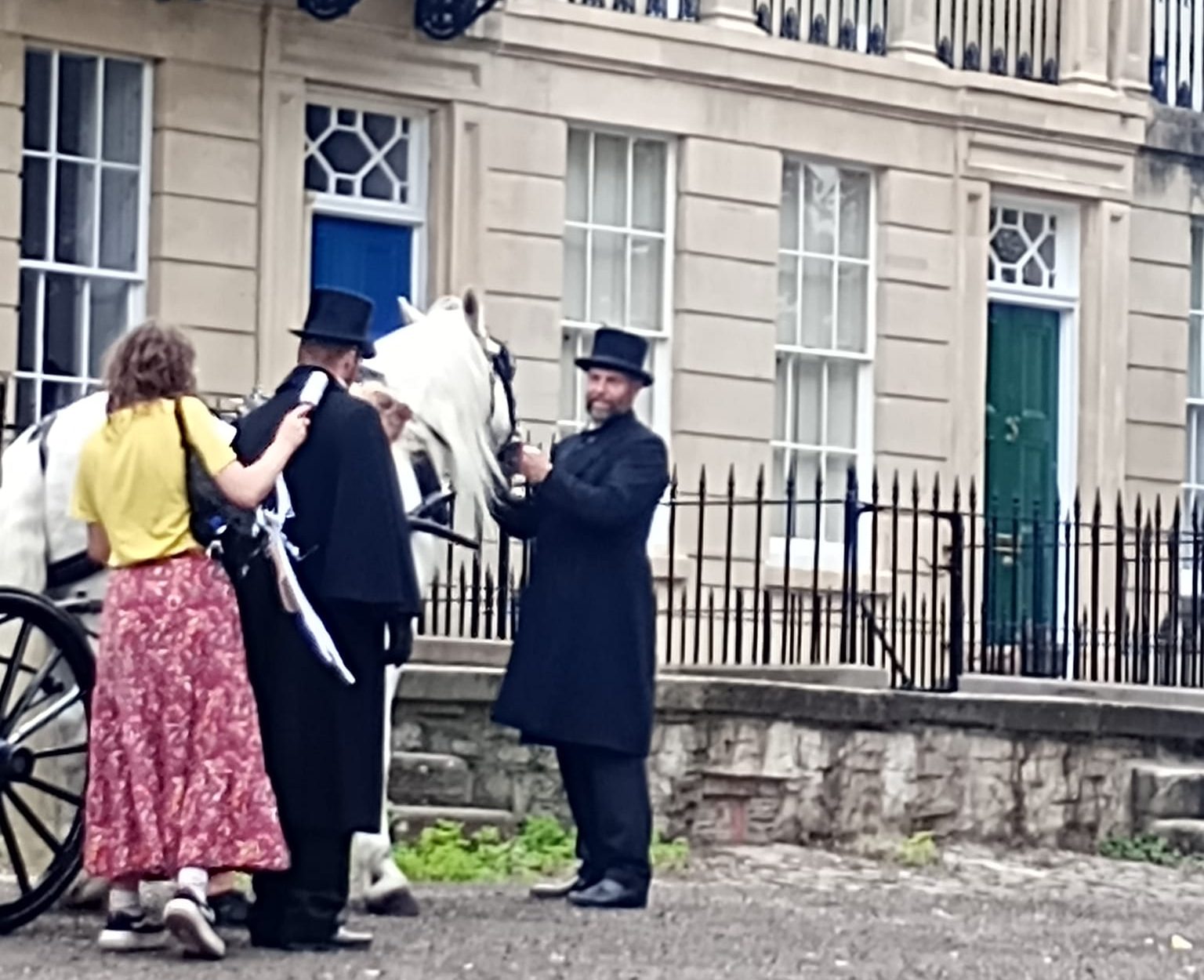 Carriages were parked on Vyvyan Terrace and cast members dressed in their Victorian attire sat in the shade of trees outside Christ Church, presumably waiting for their scene.