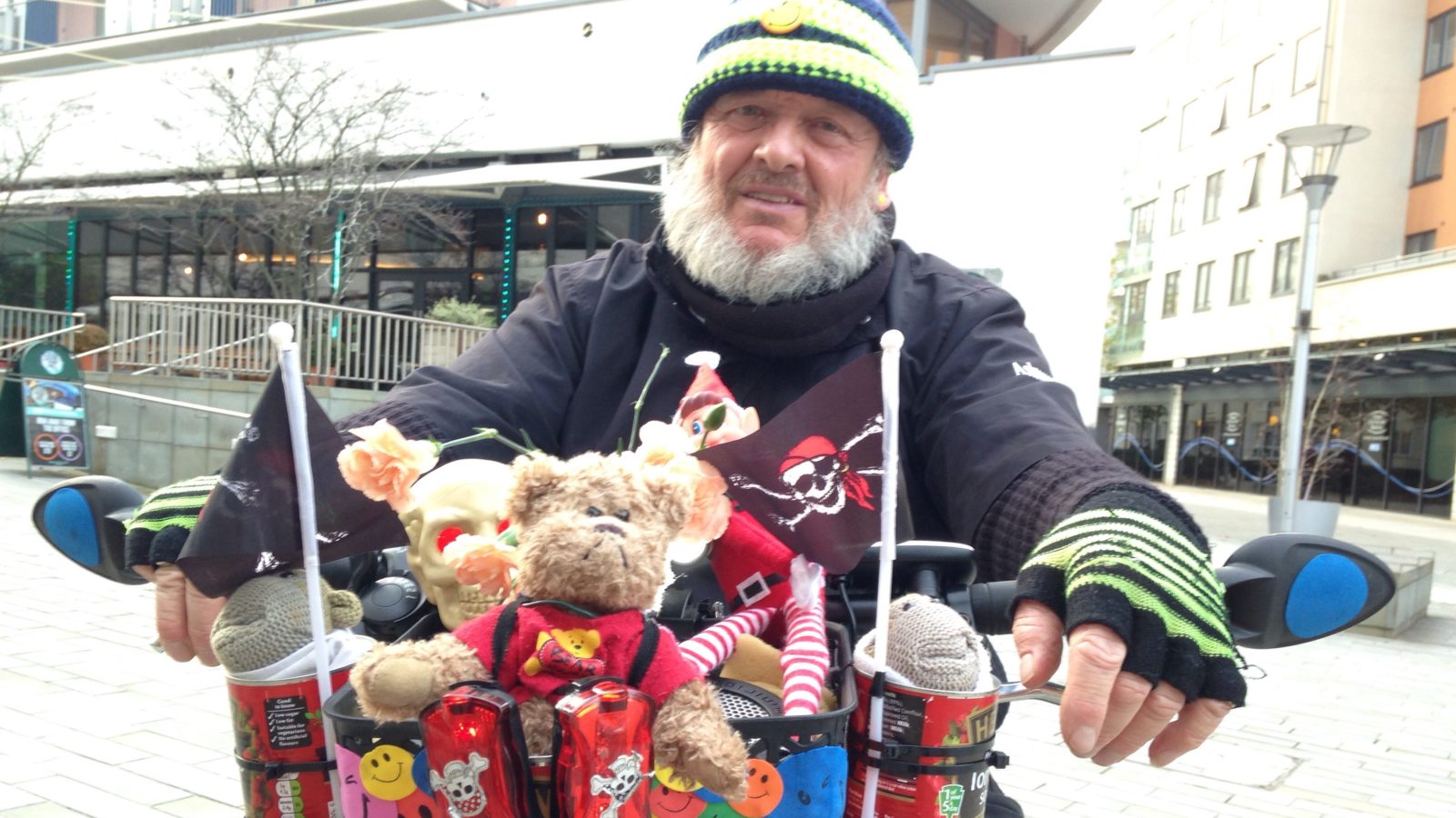 It all started with the 65-year-old putting a pirate flag on his new bike, and it escalated from there. He now has two bikes, with the larger one covered in so many trinkets that its frame is barely visible.