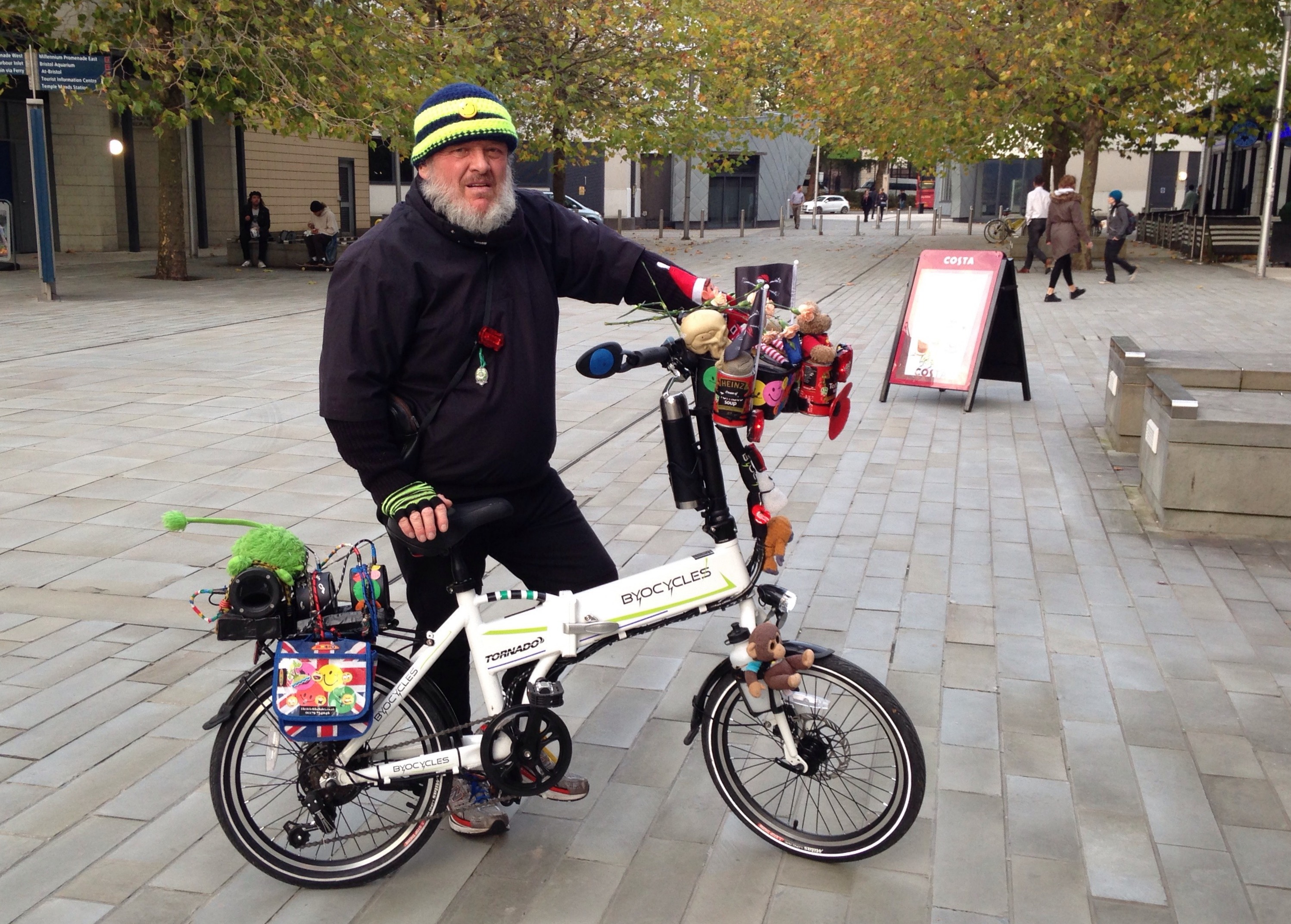His foldable winter version, which he recently bought from Atmosphere Electric Bikes at the bottom of Jacob’s Wells Road, is smaller and currently has a couple of flags, baskets front and back each containing two Bristol-made Minirig speakers, a subwoofer, and around a dozen cuddly toys including two PG Tips monkeys in tomato soup cans.