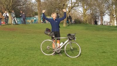 Two small panniers hold his snacks (an apple and a cereal bar today) and Brian also wears a small shoulder bag, in which he always carries “a couple of bob” to give to homeless people he passes on his route; today he has accessorised his handlebars with a few purple roses given to him by a man sat on Pero’s Bridge.