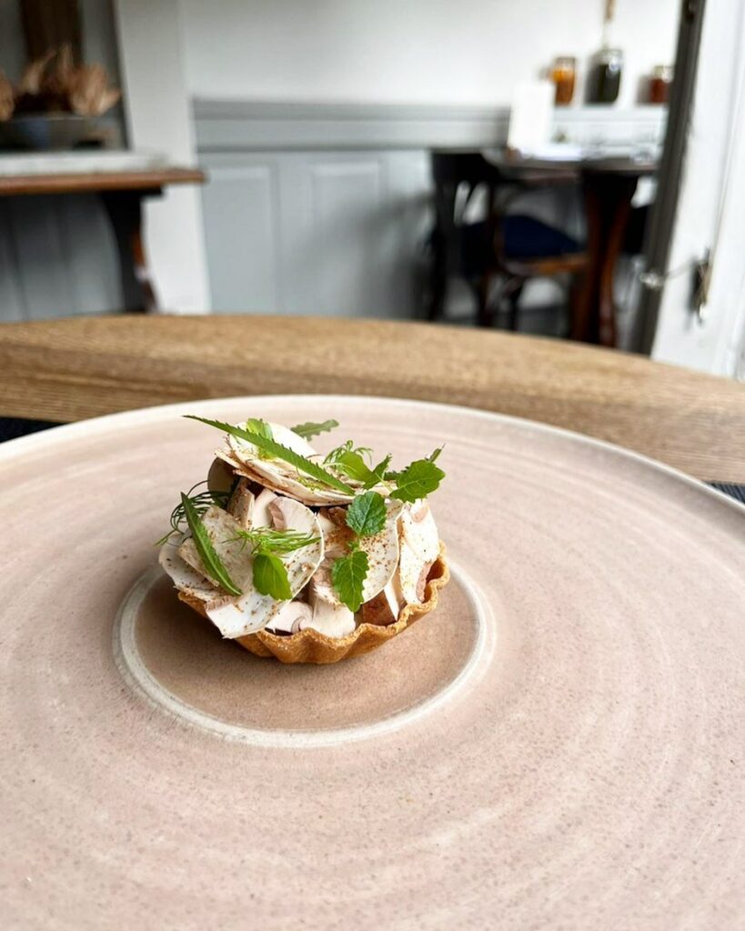From the tasting menu at Bulrush: a cep and violet artichoke barigoule tart made with a dashi shortcut pastry, and a cured egg yolk and whisky purée – photo: Bulrush