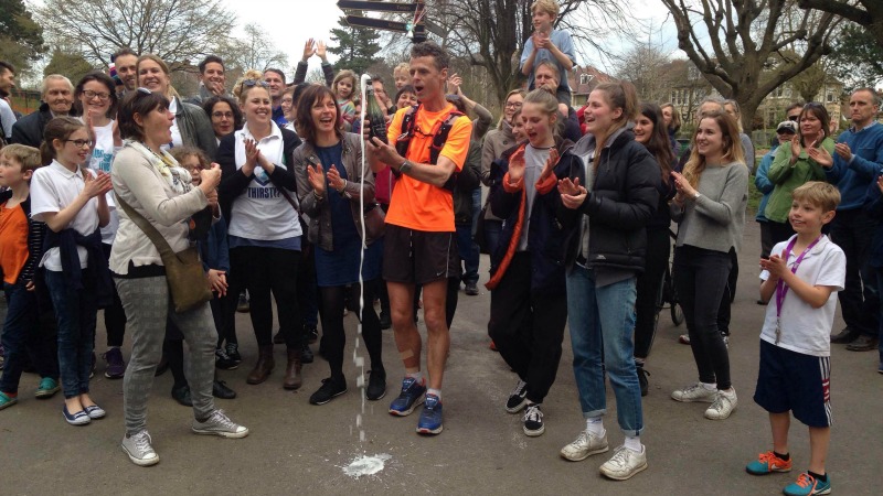 Entering the park flanked by fellow runners, a remarkably fresh Andy was soon presented with a bottle of champagne.