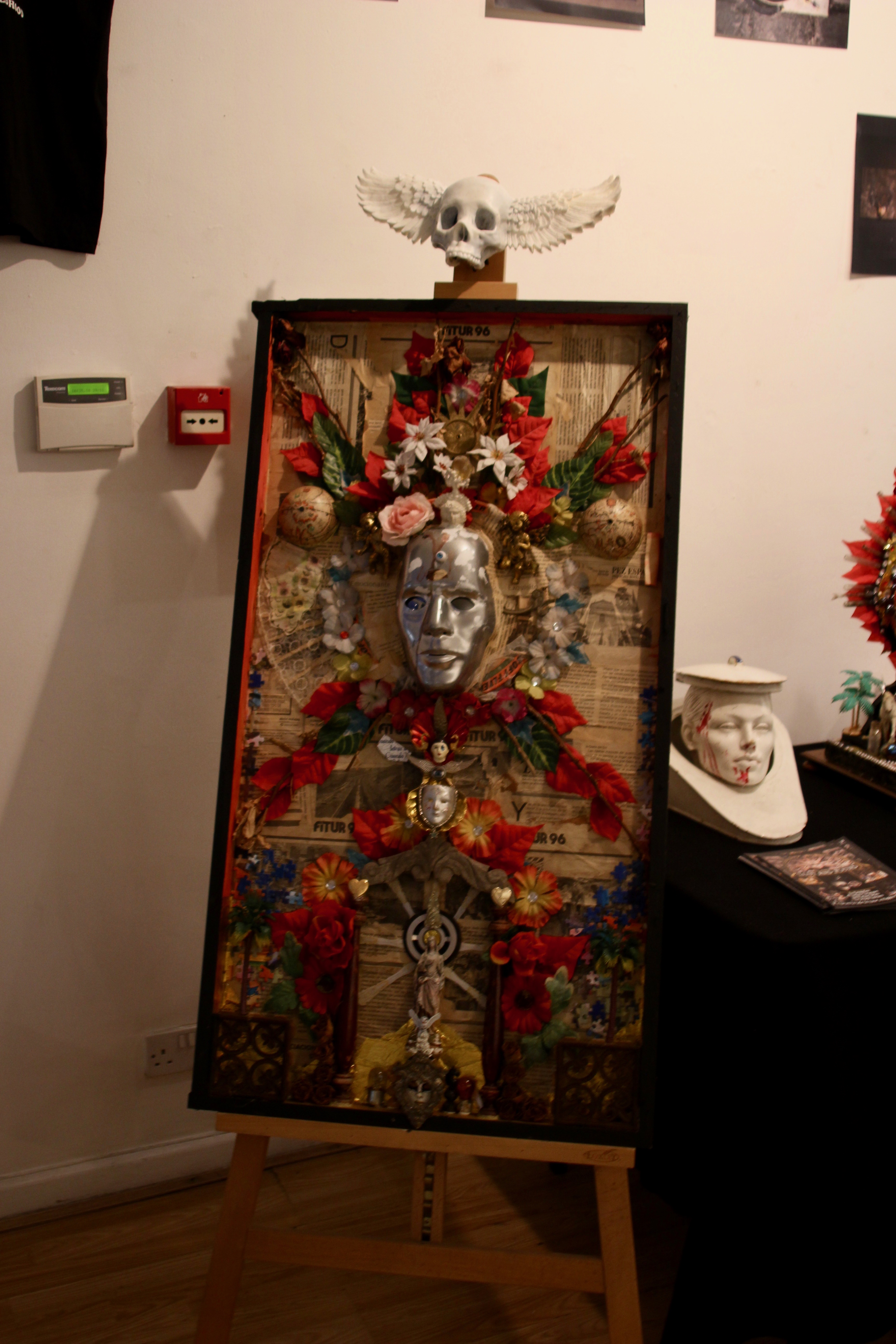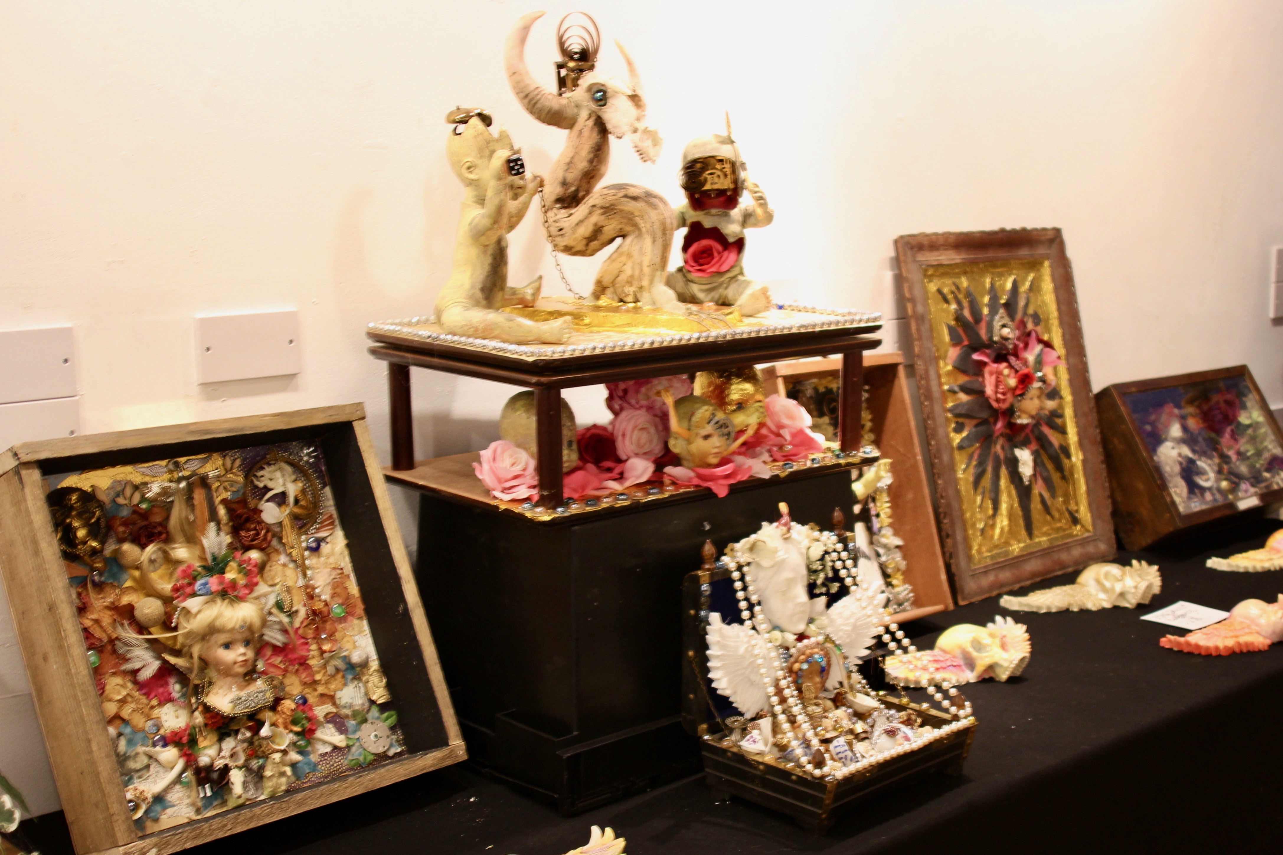 The works in this exhibition have all been created from things Doug has picked up and collected over the years, “the stuff you think you’ll do something with one day” as he puts it. “It’s old props from former shows, things I’ve found in skips and bins and flea markets. Lots are things that were left behind from our time in spaces like the Pro Cathedral. Bits and pieces and shiny things that I collected up.”