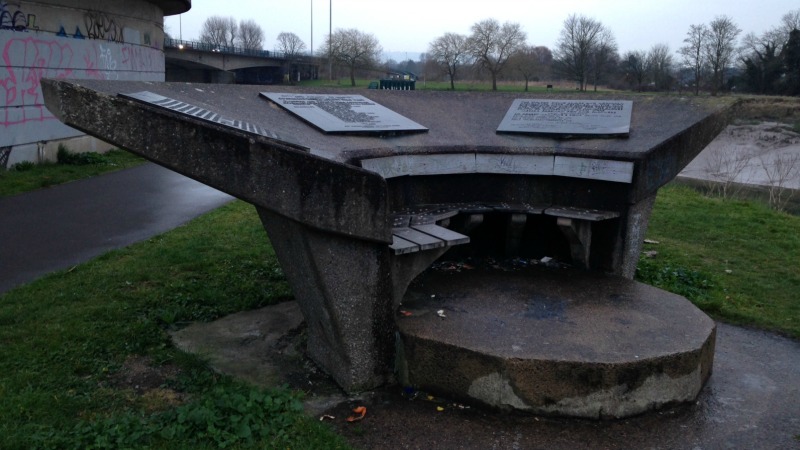Perhaps the oddest thing about it, though, is that it’s also home to a monument – a sort of concrete podium facing away from the water. If the scurf of empty bottles and broken glass is anything to go by, its primary function these days is as a hang-out for clandestine boozers. Its original purpose, however, was to celebrate the very road system which has cut it – and the patch of grass it stands on – from the rest of the city.