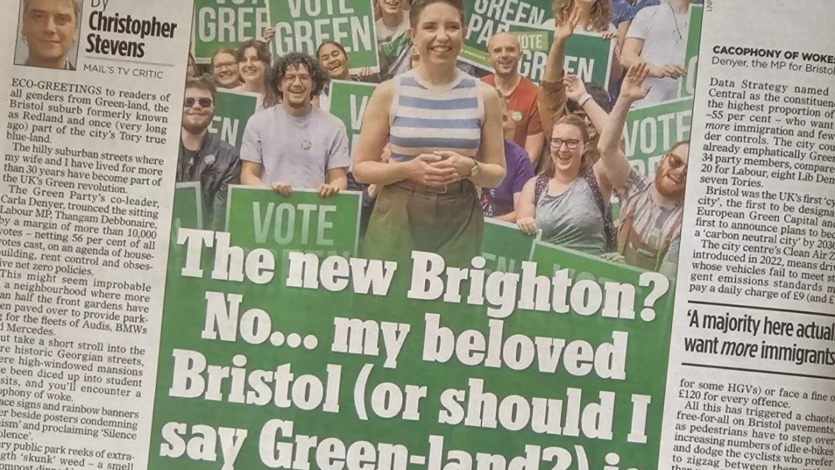 Because following the election of Bristol’s first Green member of parliament, the television critic of the Daily Mail appears to be furious about what has happened to his “beloved” home city.