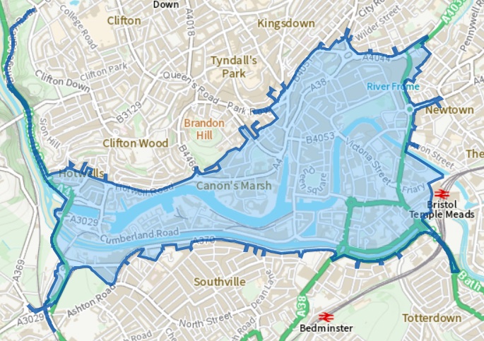 Bristol’s Clean Air Zone stretches from the Portway to the Three Lamps junction – map: Bristol City Council