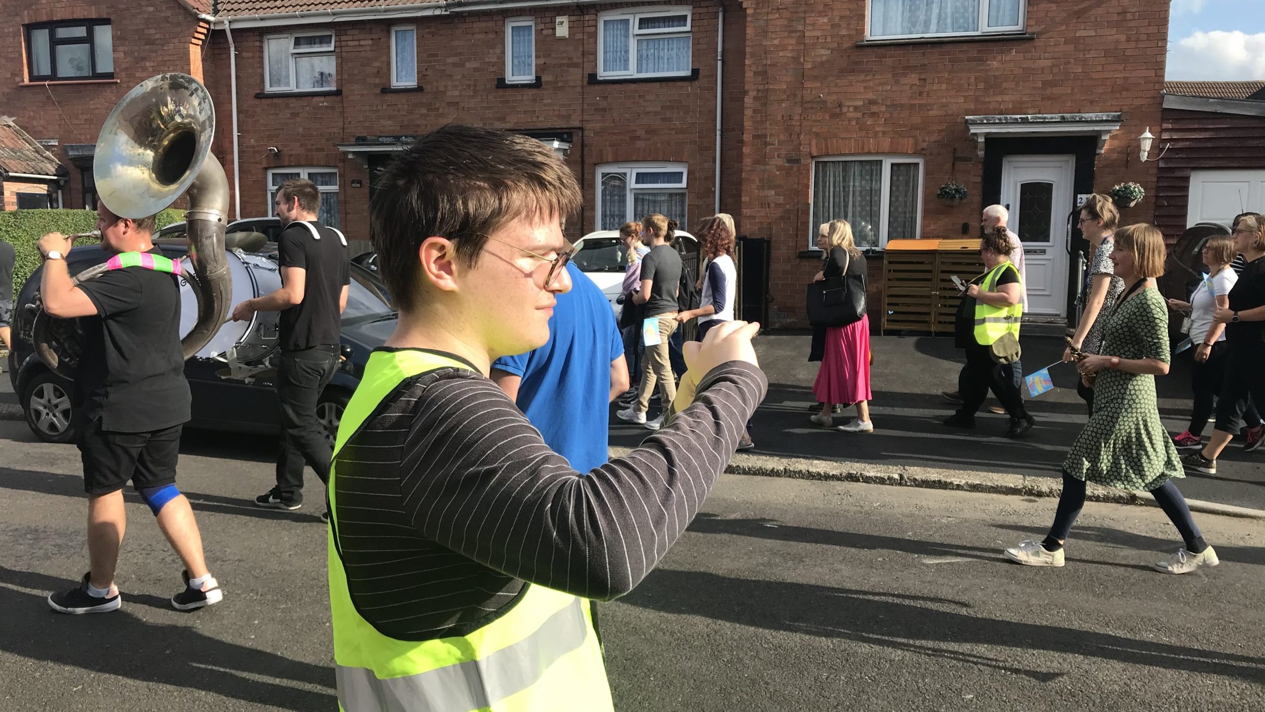 Charlie Watts reporting on Paraorchestra parade in Knowle West – photo by Martin Booth