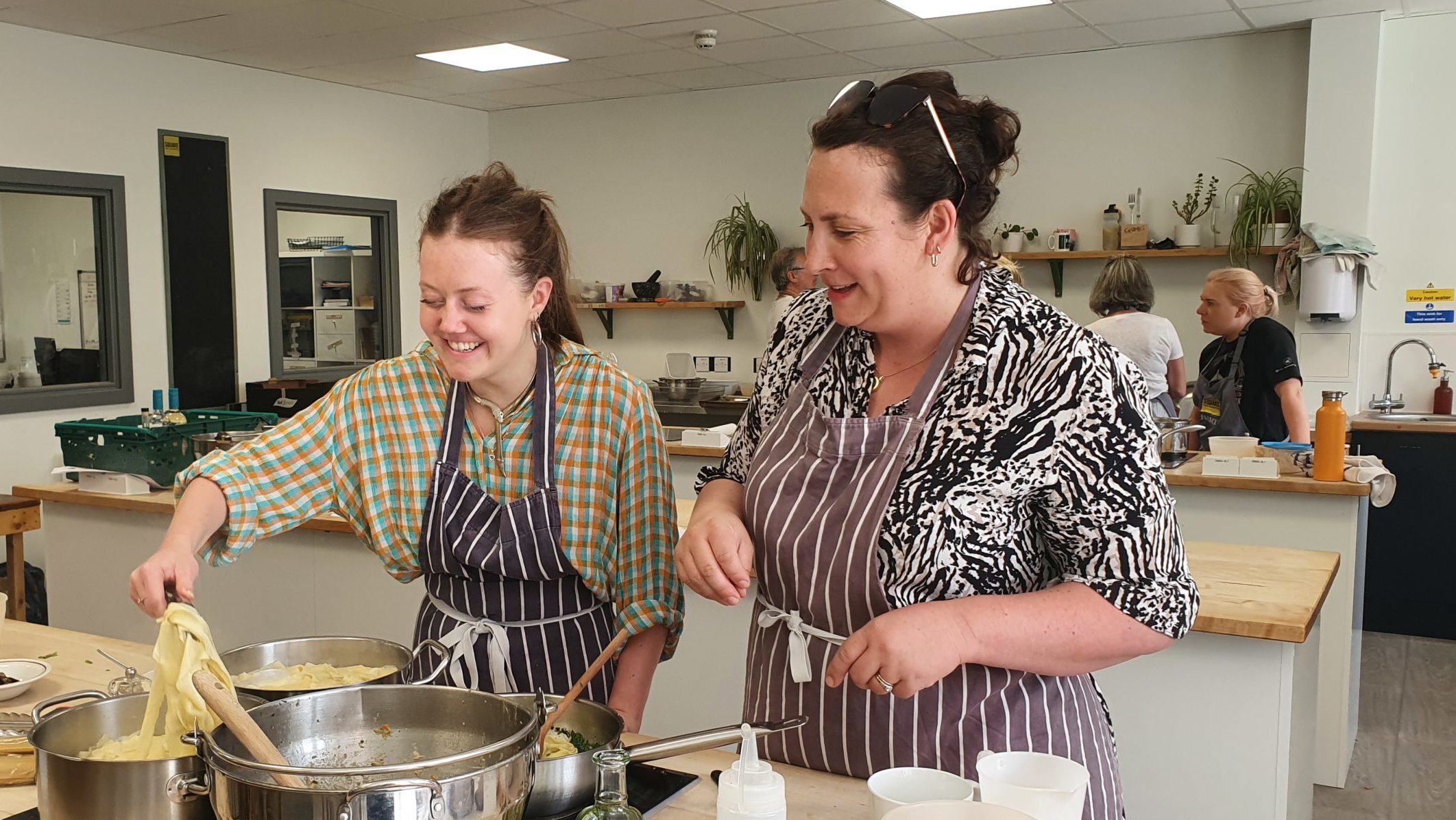 Charlotte Fife in the Square Food kitchen with Lilia Chedzey, who’s taking part in the How To Be A Chef programme – photo Ellie Pipe