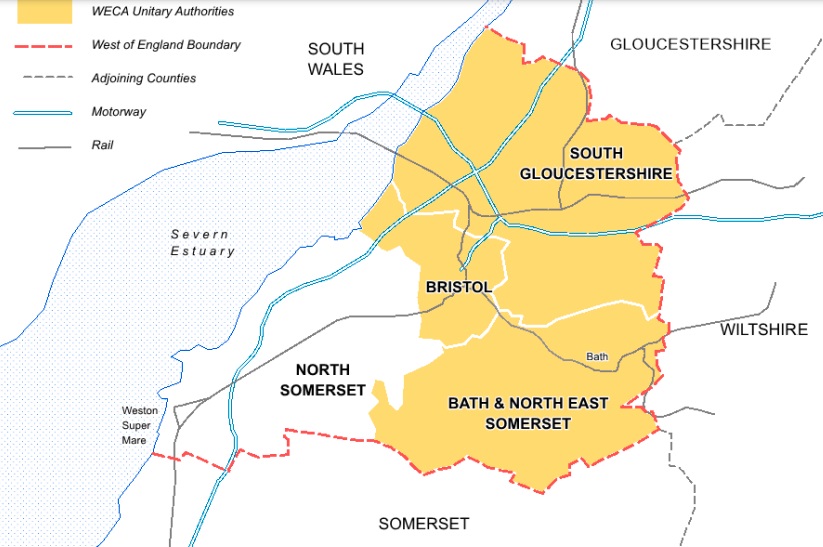 The West of England Combined Authority covers Bristol, South Glos and B&NES but not North Somerset – map: WECA