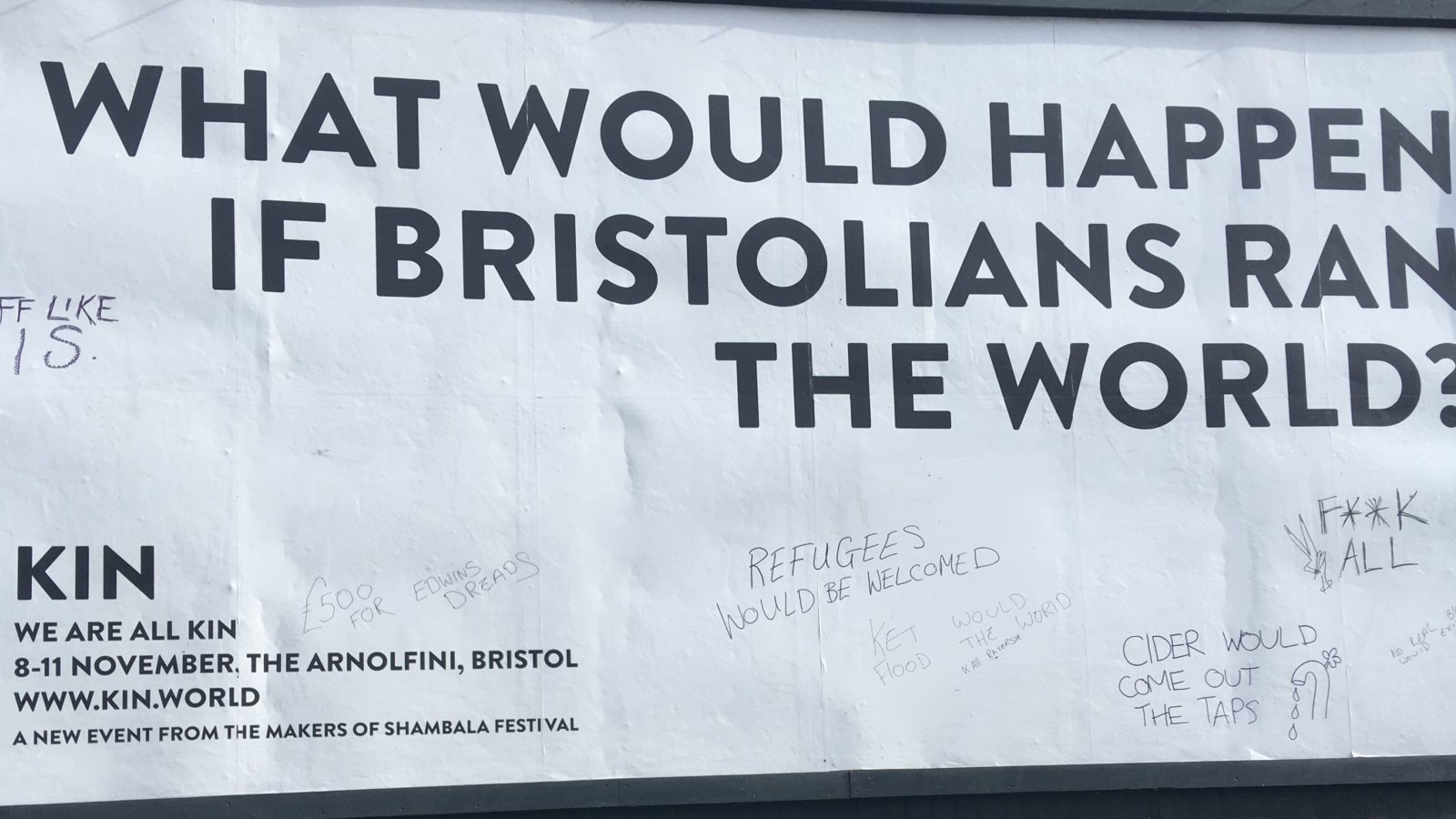 They read: “What would happen if Bristolians ran the world?” and someone’s already scribbled “refugees would be welcomed”, “cider would come out of the taps,” and “f**k all.”