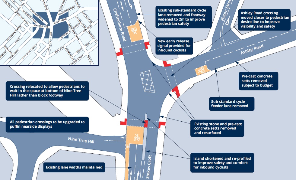A plan of the works that have taken place at the Cheltenham Road and Ashley Road junction – image: Bristol City Council