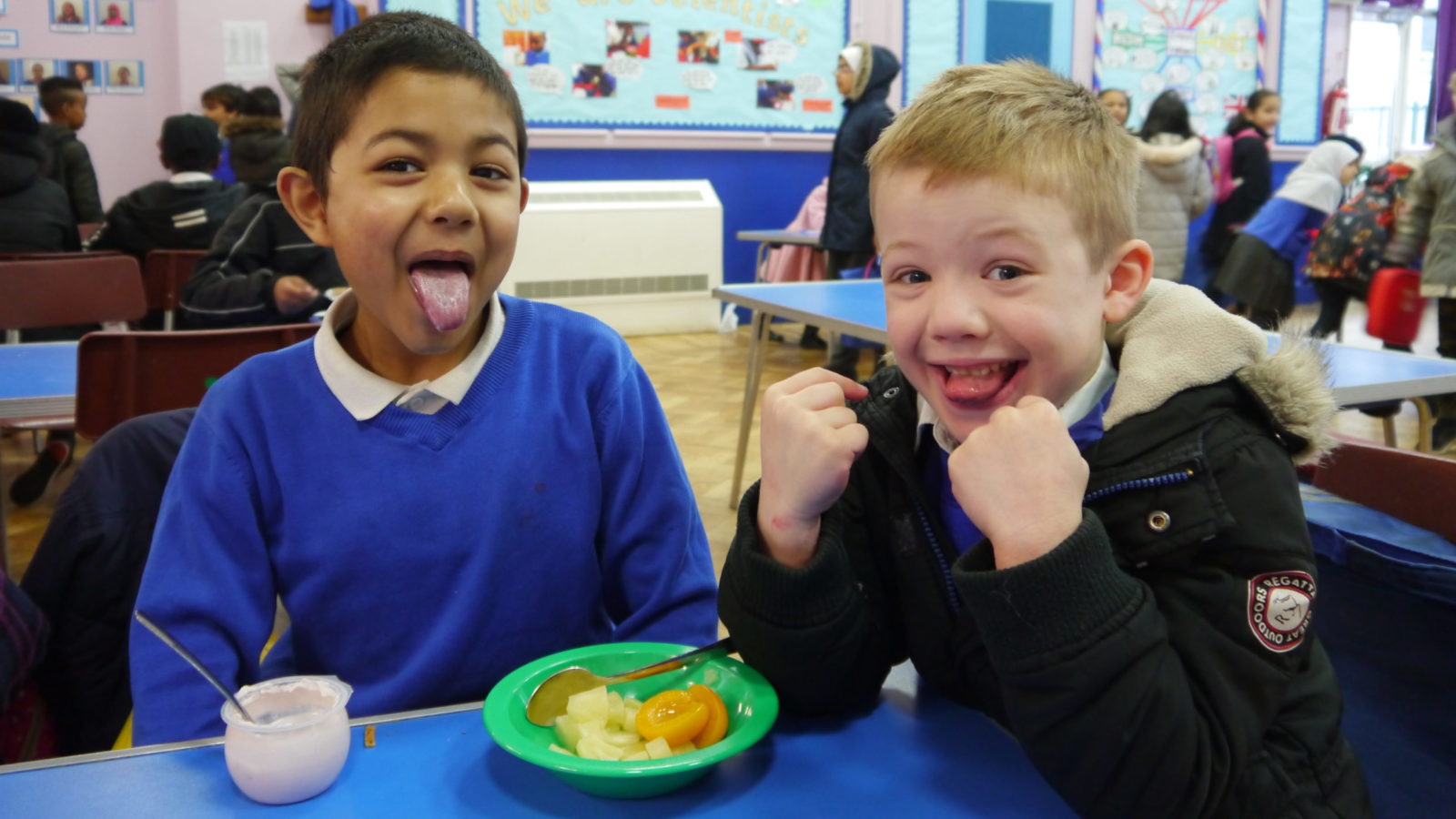 Main photo of Ayaan and Ben at Millpond Primary Breakfast Club, provided courtesy of FareShare South West