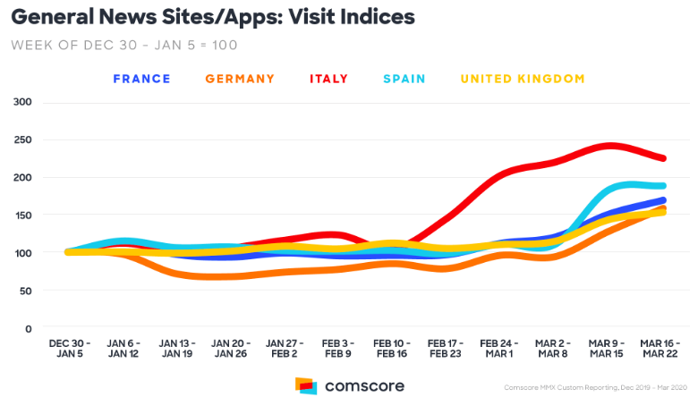 According to Comscore, news websites and mobile apps in the week of March 16-22, 2020 went up by 68 per cent in France, 57 per cent in Germany, 125 per cent in Italy, 87 per cent in Spain, and 51 per cent in the UK.