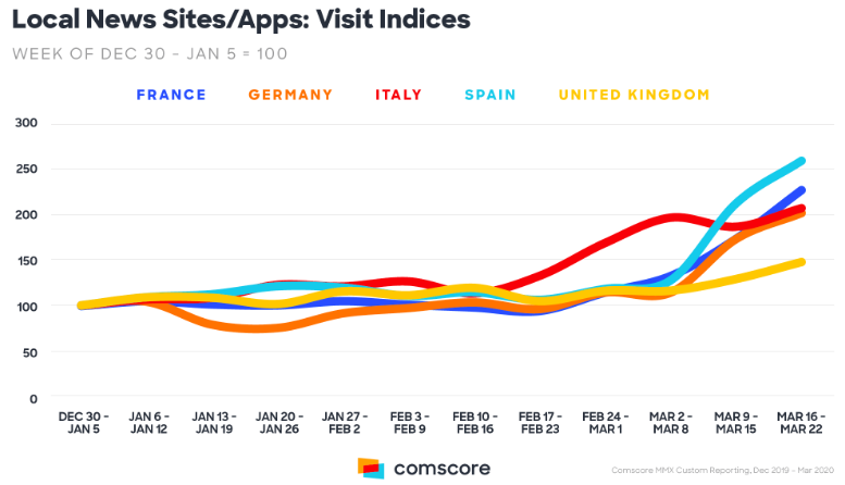A similar patterns occurs with local news. The week of March 16-22, 2020, traffic to local news sites went up by 158 per cent in Spain, 125 per cent in France, 105 per cent in Italy, 101 per cent in Germany and 45 per cent in the UK.