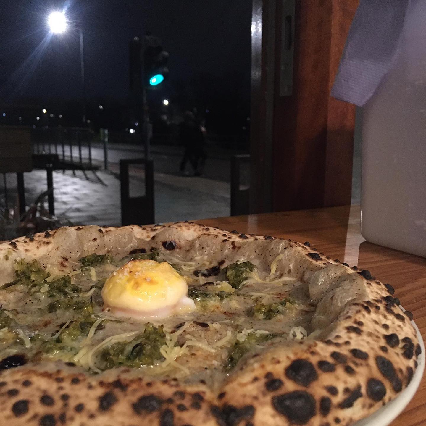 Bertha’s Pizza’s recent collaboration with fellow Wapping Wharf restaurant Box-E: truffled white base, buttered leek, confit duck egg and Cornish gouda – photo: Bertha’s Pizza