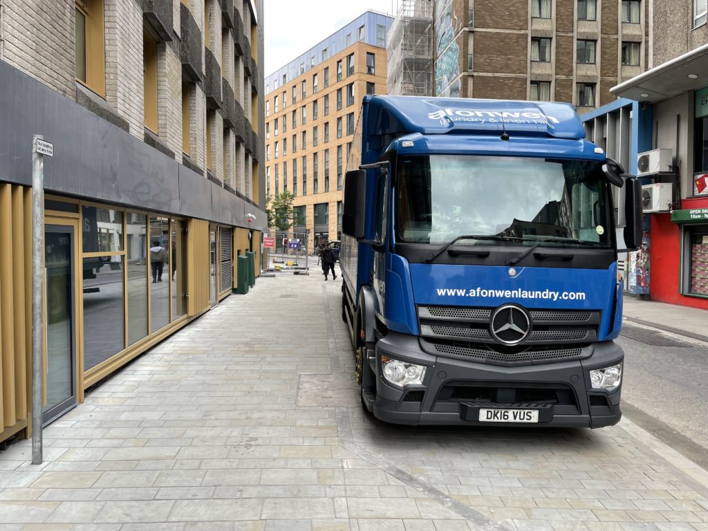 A lorry parked in the shared space area between the two sections of the new Nelson Street cycle path when it opened for just over a week in May 2022 – photo: Martin Booth