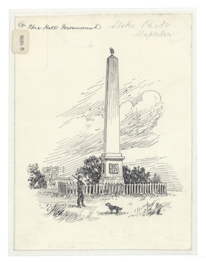 Continuing along the footpath, I come to the gates of Stoke Park. Carrying on, under the motorway and around a sharp corner, one is presented with a stunning view of the estate. Dower House, repurposed for the Stoke Park Colony at the turn of the twentieth century and later turned into flats, dominates the view to the right with yellow, contrasting beautifully against the blue of the sky. To the left, across the rolling fields, lies Star Hill Monument. Built in 1760, it was damaged on multiple occasions by lightning, the existing structure having been only partly restored. Luckily, both the Stoke Park Colony building and the monument were commemorated in the art of Loxton, and turning back to them, one can imagine standing in that spot 100 years ago.