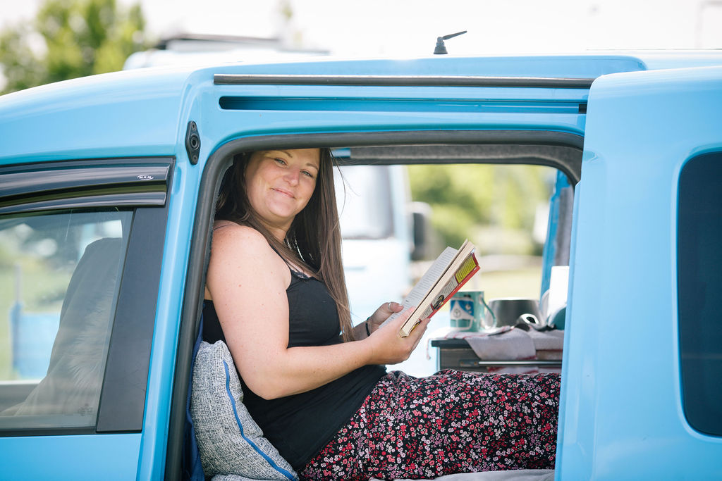 Sam in her surfing van, which she began living in after being evicted during lockdown – photo: Ibby
