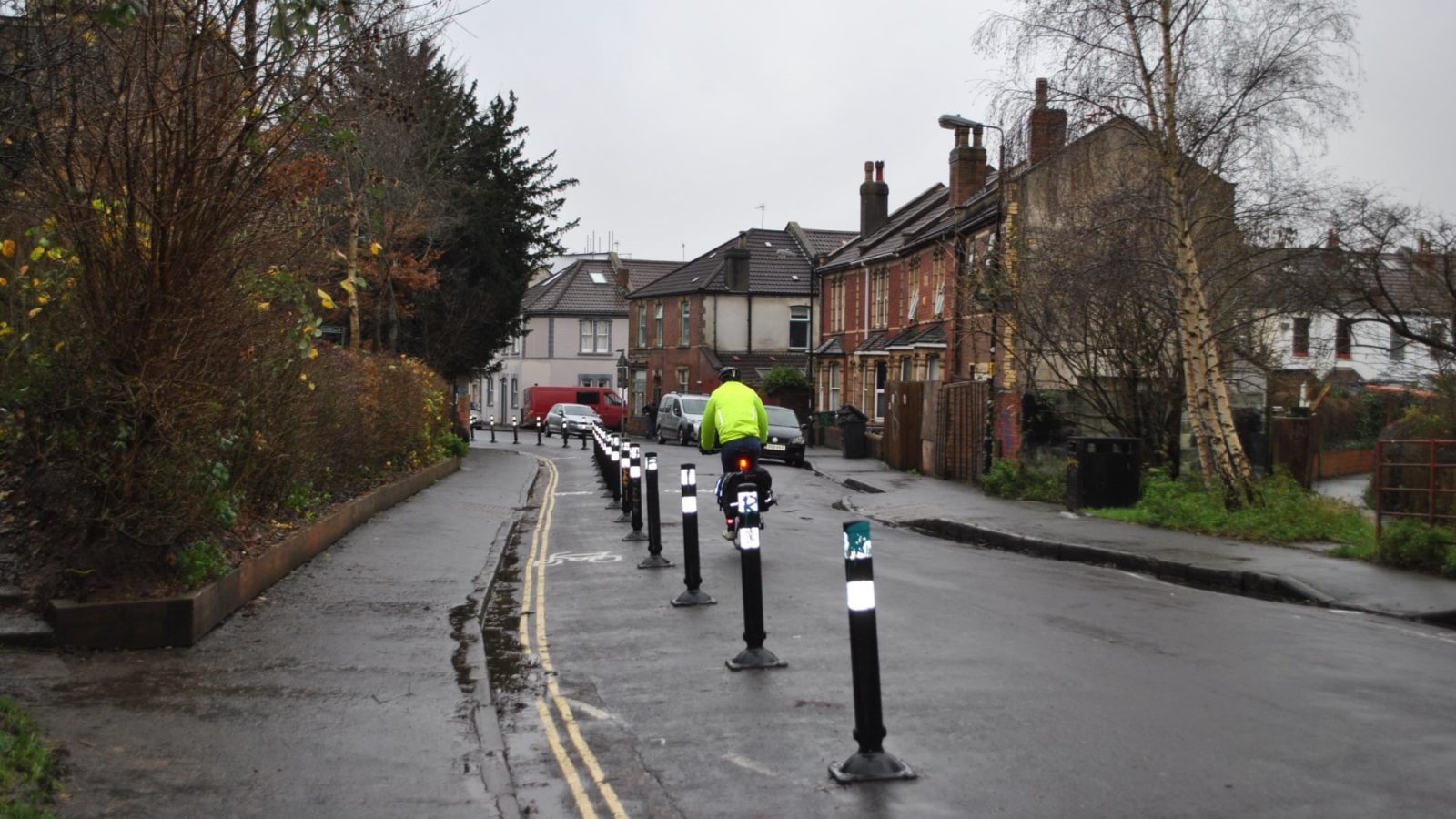 The new cycle lane is a beefy, metal bollarded affair creating very strong separation from vehicles. It’s much more permanent and sturdy than the cycle lanes simultaneously installed on much busier central thoroughfares like Park Row and the Clifton Triangle.