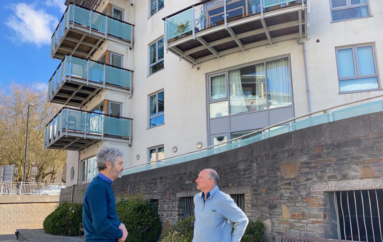 Jerome Thomas, Green Party candidate for WECA mayor and safety practitioner, with Fraser Bridgeford of Bristol Cladding Action Group in front of one of the affected Bristol lower-rise buildings with problem cladding. Photo: Jerome Thomas