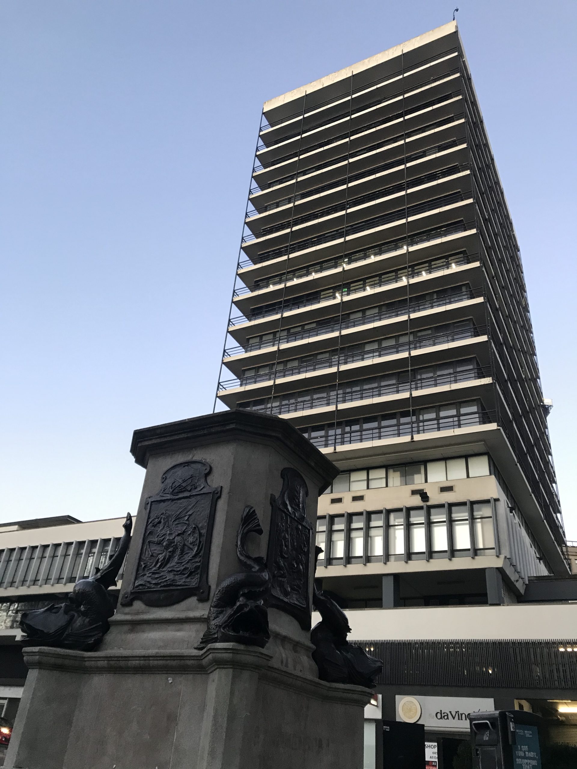 The former Colston Tower looks over the empty plinth on which the statue of Edward Colston used to stand – photo: Martin Booth