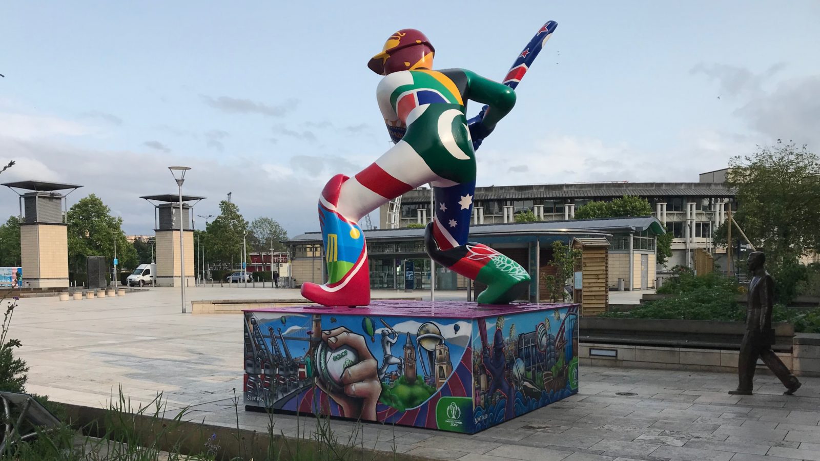 And dozens of cricket fans helped paint a huge statue of a cricketer and his bat on Millennium Square made up of the flags of all of the 10 World Cup teams.
