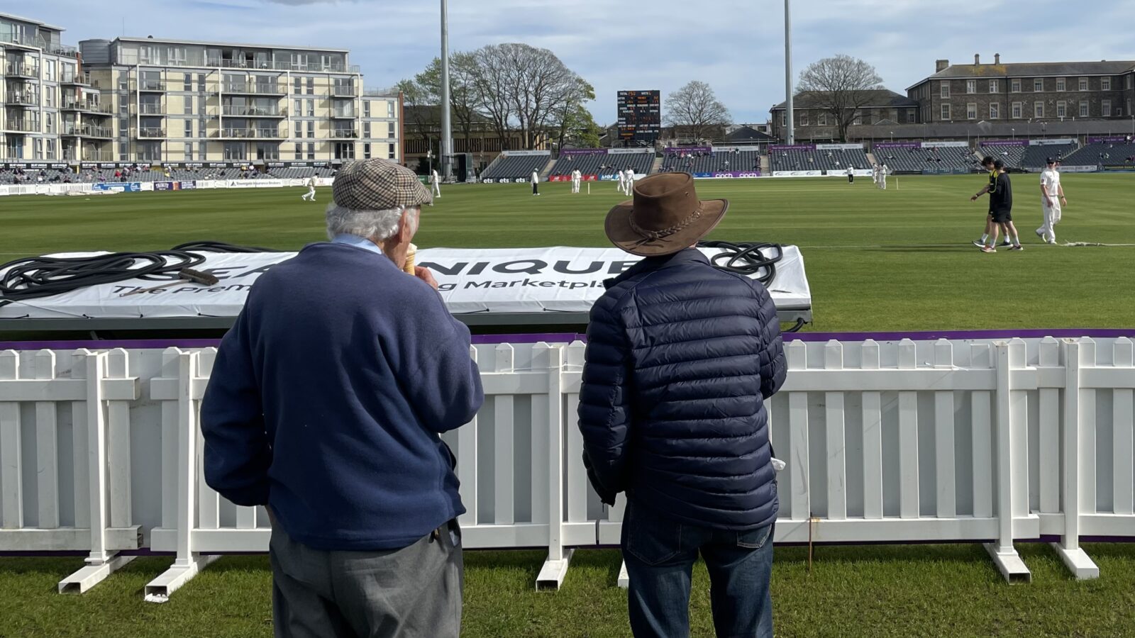 An MCC-branded cushion and a cool bag were the signs that two seats had already been reserved, their owners eventually returning with a Labrador dog, Benny, wearing a yellow Gloucestershire lanyard who was soon given an ice cream that he finished in just a couple of bites.